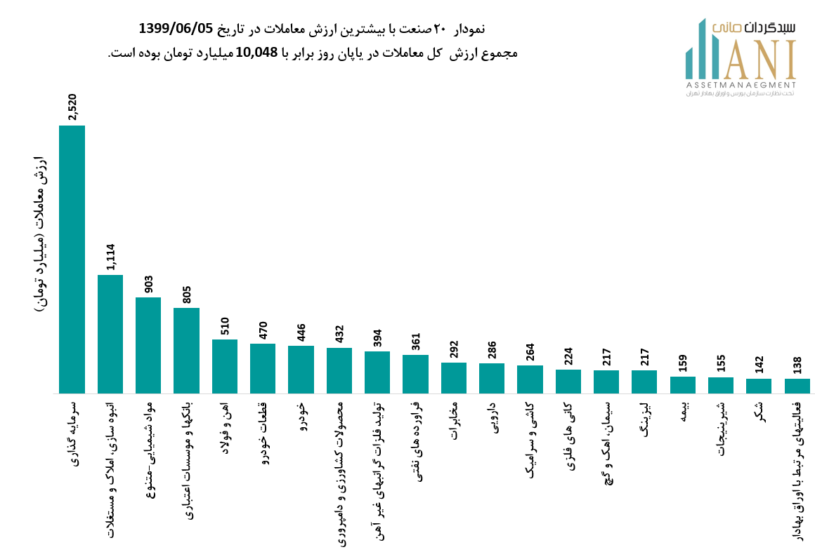 نمودار 20 صنعت با بیشترین ارزش معاملات در تاریخ 1399/06/05، مجموع ارزش کل معاملات در پایان روز برابر با 10,048 میلیارد تومان بوده است. صنایع سرمایه گذاری،انبوه سازی،املاک و مستغلات ،مواد شیمیایی و بانک ها به ترتیب 25%، 11% ،9% و 8% از ارزش کلی معاملات را به خود اختصاص داده اند.