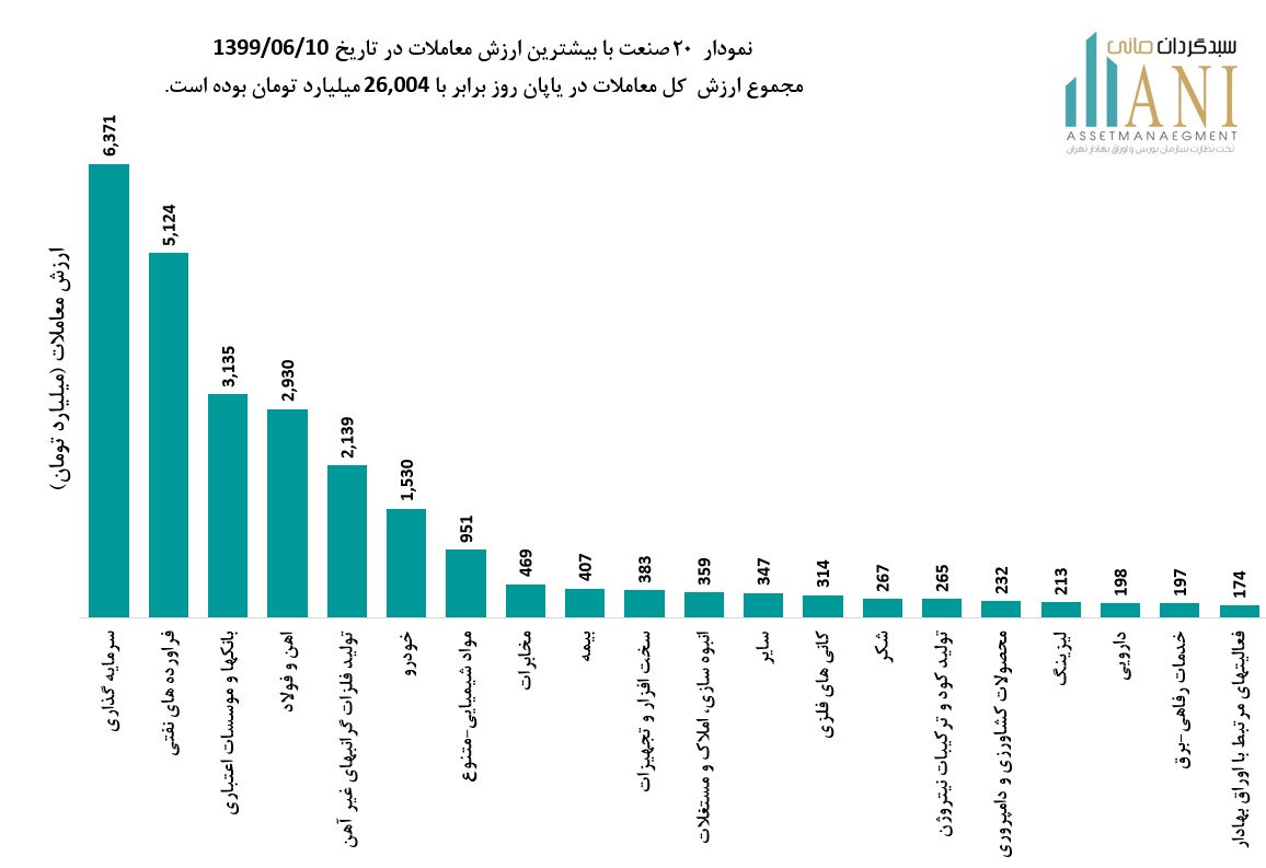 نمودار 20 صنعت با بیشترین ارزش معاملات در تاریخ 1399/06/10، مجموع ارزش کل معاملات در پایان روز برابر با 26,004 میلیارد تومان بوده است. صنایع سرمایه گذاری،فراورده های نفتی،بانک ها و آهن و فولاد به ترتیب 25%، 20% ،12% و 11% از ارزش کلی معاملات را به خود اختصاص داده اند.