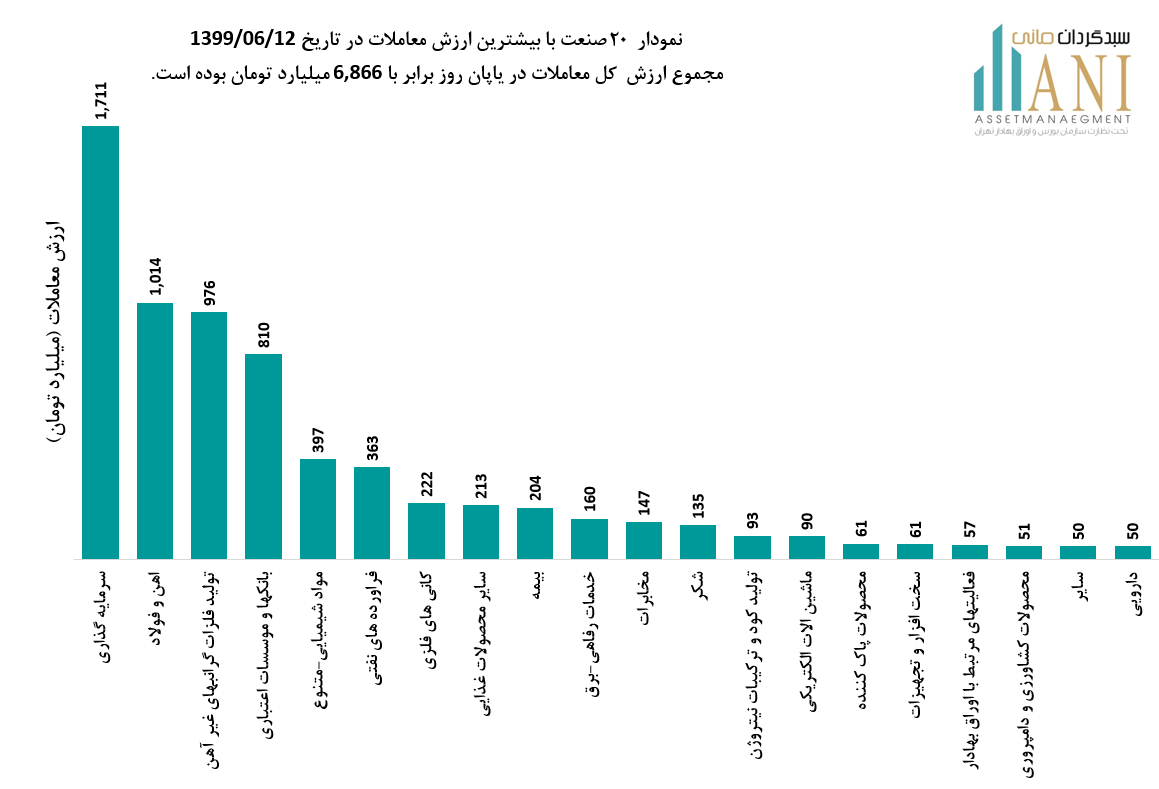 نمودار 20 صنعت با بیشترین ارزش معاملات در تاریخ 1399/06/12، مجموع ارزش کل معاملات در پایان روز برابر با 6,866 میلیارد تومان بوده است. صنایع سرمایه گذاری،آهن و فولاد، تولید فلزات گرانبهای غیر آهن و بانک ها به ترتیب 25%، 15% ،14% و 12% از ارزش کلی معاملات را به خود اختصاص داده اند.