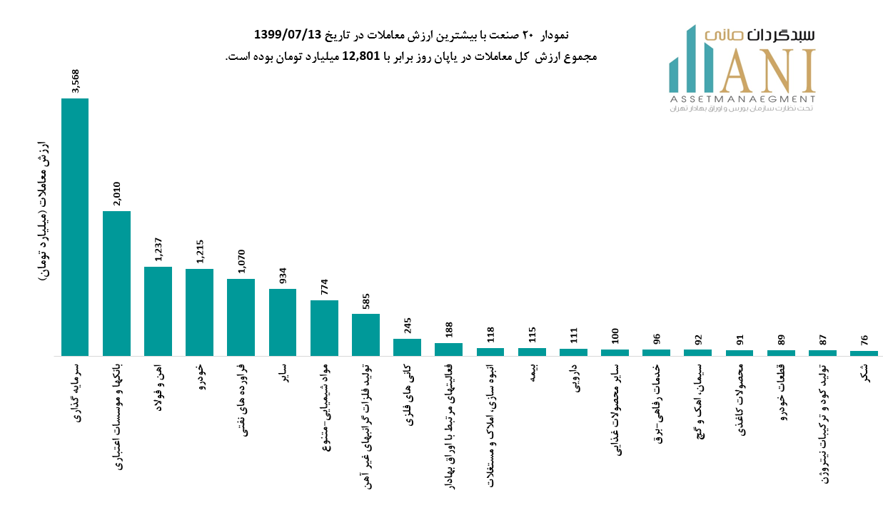 نمودار 20 صنعت با بیشترین ارزش معاملات در تاریخ 1399/07/13، مجموع ارزش کل معاملات در پایان روز برابر با 12,801 میلیارد تومان بوده است. صنایع سرمایه گذاری،بانک ها، ،آهن و فولاد و خودرو به ترتیب 28%،16% ،10% و 9% از ارزش کلی معاملات را به خود اختصاص داده اند.