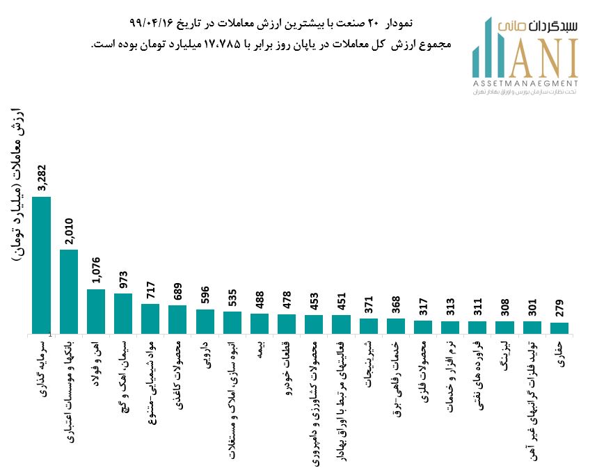 نمودار 20 صنعت با بیشترین ارزش معاملات در تاریخ 1399/04/16، مجموع ارزش کل معاملات در پایان روز برابر با 17,785 میلیارد تومان بوده است. صنایع سرمایه گذاری،بانک ها ، آهن و فولاد و سیمان،آهک و گچ به ترتیب 18%، 11% ، 1% و 1% از ارزش کلی معاملات را به خود اختصاص داده اند.