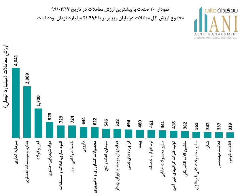 نمودار 20 صنعت با بیشترین ارزش معاملات در تاریخ 1399/04/17، مجموع ارزش کل معاملات در پایان روز برابر با 21,496 میلیارد تومان بوده است. صنایع سرمایه گذاری،بانک ها ، آهن و فولاد و مواد شیمیایی به ترتیب 19%، 14% ، 8% و 4% از ارزش کلی معاملات را به خود اختصاص داده اند.