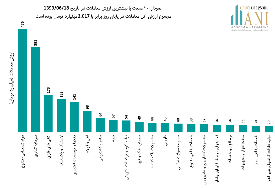 نمودار 20 صنعت با بیشترین ارزش معاملات در تاریخ 1399/06/18، مجموع ارزش کل معاملات در پایان روز برابر با 2,017 میلیارد تومان بوده است. صنایع مواد شیمیایی،سرمایه گذاری، کانی های فلزی و لاستیک و پلاستیک و فولاد به ترتیب 24%، 19% ،9% و 8% از ارزش کلی معاملات را به خود اختصاص داده اند.