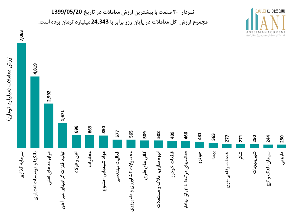 نمودار 20 صنعت با بیشترین ارزش معاملات در تاریخ 1399/05/20، مجموع ارزش کل معاملات در پایان روز برابر با 24,343 میلیارد تومان بوده است. صنایع سرمایه گذاری،بانک ها ،فرآورده های نفتی و تولیدات فلزات گرانبهای غیر آهن به ترتیب 29%، 20% ،12% و 7% از ارزش کلی معاملات را به خود اختصاص داده اند.