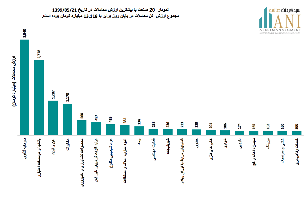 نمودار 20 صنعت با بیشترین ارزش معاملات در تاریخ 1399/05/20، مجموع ارزش کل معاملات در پایان روز برابر با 13,118 میلیارد تومان بوده است. صنایع سرمایه گذاری،بانک ها ،آهن و فولاد و مخابرات به ترتیب 27%، 21% ،10% و 9% از ارزش کلی معاملات را به خود اختصاص داده اند.