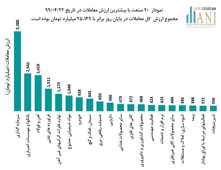 نمودار 20 صنعت با بیشترین ارزش معاملات در تاریخ 1399/04/22، مجموع ارزش کل معاملات در پایان روز برابر با 25,149 میلیارد تومان بوده است. صنایع سرمایه گذاری،بانک ها ، آهن و فولاد و فراوده های نفتی به ترتیب  20%، 10% ، 10% و 6%  از ارزش کلی معاملات را به خود اختصاص داده اند.