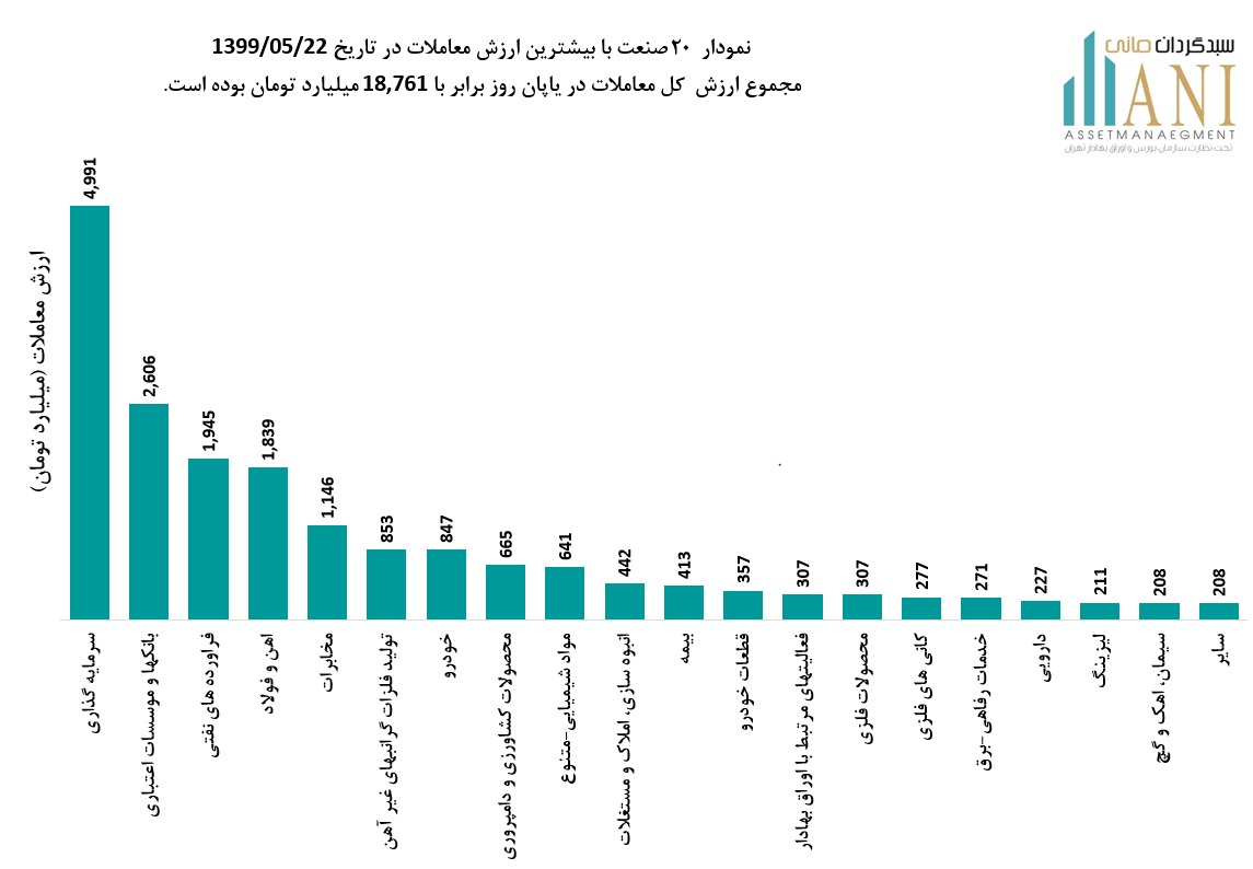 نمودار 20 صنعت با بیشترین ارزش معاملات در تاریخ 1399/05/22، مجموع ارزش کل معاملات در پایان روز برابر با 18,761 میلیارد تومان بوده است. صنایع سرمایه گذاری،بانک ها ،فرآورده های نفتی و آهن و فولاد به ترتیب 27%، 14% ،10% و 10% از ارزش کلی معاملات را به خود اختصاص داده اند.