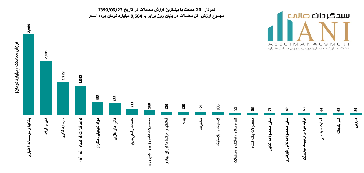 نمودار 20 صنعت با بیشترین ارزش معاملات در تاریخ 1399/06/23، مجموع ارزش کل معاملات در پایان روز برابر با 9,664 میلیارد تومان بوده است. صنایع بانک ها،آهن و فولاد، سرمایه گذاری و تولید فلزات گرانبهای غیر آهن به ترتیب 31%، 21% ،13% و 11% از ارزش کلی معاملات را به خود اختصاص داده اند.