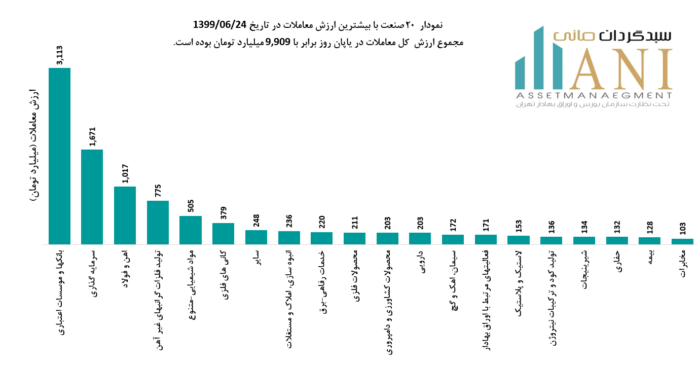 نمودار 20 صنعت با بیشترین ارزش معاملات در تاریخ 1399/06/24، مجموع ارزش کل معاملات در پایان روز برابر با 9,909 میلیارد تومان بوده است. صنایع بانک ها،سرمایه گذاری،آهن و فولاد و تولید فلزات گرانبهای غیر آهن به ترتیب 31%، 17% ،10% و 8% از ارزش کلی معاملات را به خود اختصاص داده اند.