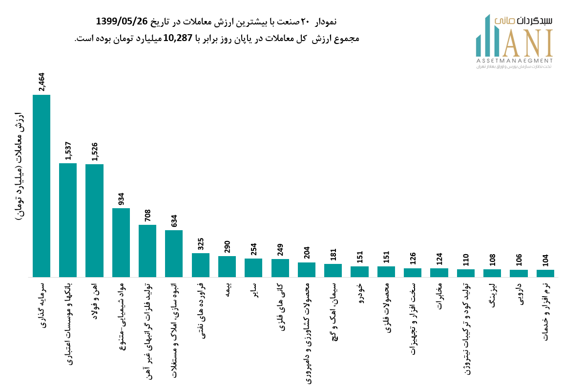 نمودار 20 صنعت با بیشترین ارزش معاملات در تاریخ 1399/05/26، مجموع ارزش کل معاملات در پایان روز برابر با 10,287 میلیارد تومان بوده است. صنایع سرمایه گذاری،بانک ها ، آهن و فولاد و موادشیمیایی به ترتیب 24%، 15% ،15% و 9% از ارزش کلی معاملات را به خود اختصاص داده اند.