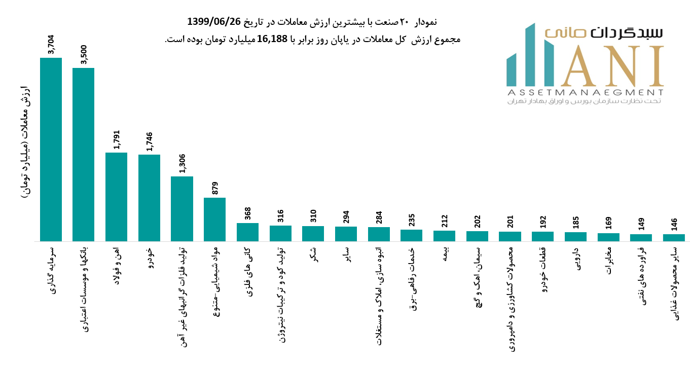 نمودار 20 صنعت با بیشترین ارزش معاملات در تاریخ 1399/06/26، مجموع ارزش کل معاملات در پایان روز برابر با 16,188 میلیارد تومان بوده است. صنایع سرمایه گذاری،بانک ها، آهن و فولاد و خودرو به ترتیب 236%، 22% ،11% و 11% از ارزش کلی معاملات را به خود اختصاص داده اند.