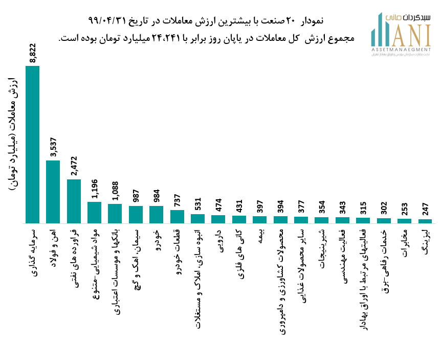 نمودار 20 صنعت با بیشترین ارزش معاملات در تاریخ 1399/04/31، مجموع ارزش کل معاملات در پایان روز برابر با 24,241 میلیارد تومان بوده است. صنایع سرمایه گذاری،آهن و فولاد، فراورده های نفتی و مواد شیمیایی به ترتیب 36%، 15% ، 10% و 5% از ارزش کلی معاملات را به خود اختصاص داده اند.