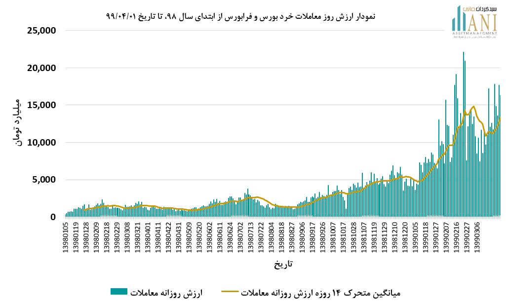 ارزش معاملات خرد سهام در بورس و فرابورس در پایان روز معاملاتی 99/04/01 حدود 16،264 میلیارد تومان و میانگین 14 روزه ارزش معاملات خرد سهام در این تاریخ حدود 13،288 میلیارد تومان بوده است.