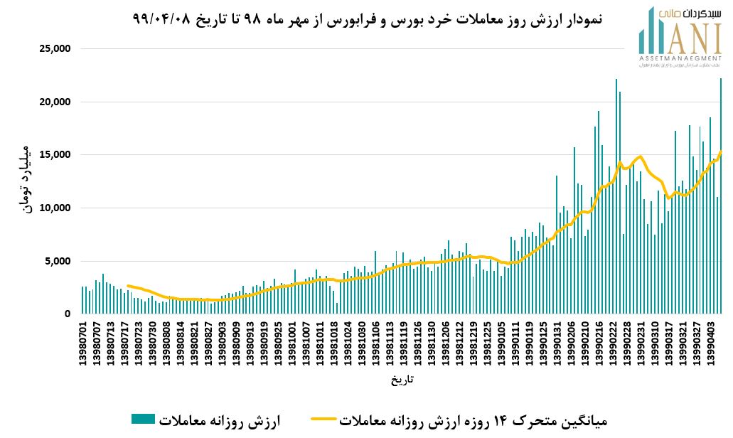 ارزش معاملات خرد سهام در بورس و فرابورس در پایان روز معاملاتی 99/04/08 حدود 22،242 میلیارد تومان و میانگین 14 روزه ارزش معاملات خرد سهام در این تاریخ حدود 15،286 میلیارد تومان بوده است.