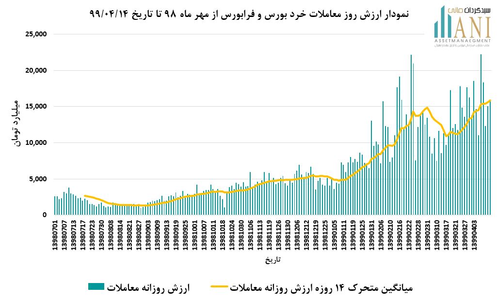 ارزش معاملات خرد سهام در بورس و فرابورس در پایان روز معاملاتی 99/04/14 حدود 15،776 میلیارد تومان و میانگین 14 روزه ارزش معاملات خرد سهام در این تاریخ حدود 15،849 میلیارد تومان بوده است.