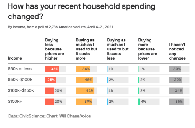 این نظرسنجی نشان می دهد در بین خانوارهایی که درآمد 50 هزار دلار یا کمتر در سال دارند، حدود 30 درصد گفته اند که به خاطر افزایش قیمتها، خرید خود را کمتر کرده اند. بیش از 25 درصد کل خانوارهای آمریکایی نیز گفته اند که به دلیل افزایش قیمتها، هزینه های خود را کاهش داده اند. به اعتقاد تحلیلگران اقتصادی، مشکل اصلی این است که دستمزدها مطابق با نرخ تورم ، افزایش پیدا نمی کند و اکثر آمریکایی ها نیز انتظار ندارند در آینده این اتفاق بیفتد. تازه ترین تحقیق فدرال رزرو نیویورک نیز نشان می دهد در حالی که انتظارات تورمی در آمریکا به بالاترین سطح خود در 7 سال اخیر رسیده و به 3.2 درصد برای یک سال و 3.1 درصد برای یک بازه زمانی 3 ساله رسیده است ولی انتظارات خانوارهای آمریکایی برای رشد دستمزد و درآمد همچنان کمتر از 2.7 درصد است.