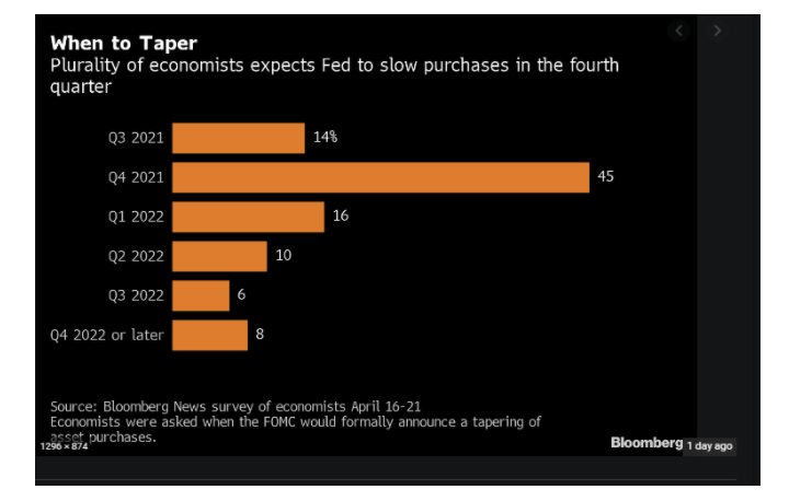 در حالی که 45 درصد اقتصاددانان اعلام کرده اند فدرال رزرو تصمیم خود برای کاهش خرید اوراق قرضه را در سه ماه پایانی امسال اعلام می کند ولی 14 درصد نیز بر این باورند که فدرال رزرو در سه ماه سوم این تصمیم را اعلام خواهد کرد.اقتصاددانان همچنین گفته اند که لحن بیانیه نشست این هفته فدرال رزرو و کنفرانس مطبوعاتی جروم پاول رئیس بانک مرکزی آمریکا می تواند تا حد زیادی وضعیت کاهش خرید اوراق قرضه را مشخص کند.