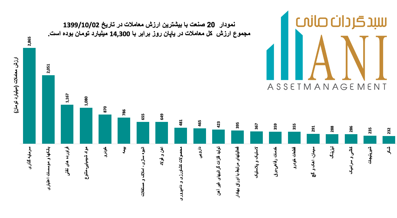 در پایان روز معاملاتی 99/10/02 صنایع فراورده های نفتی و محصولات سرمایه گذاری و بانکها و موسسات اعتباری به ترتیب با 2,865 و 2,051 میلیارد تومان بیشترین ارزش معاملاتی را داشته اند.