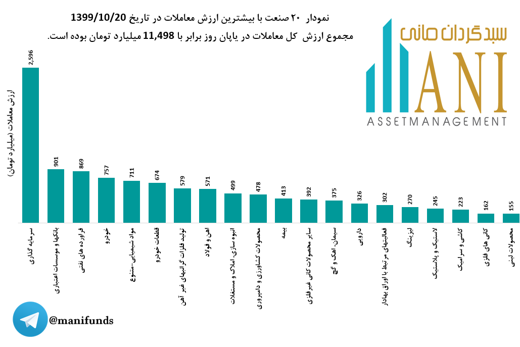 در پایان روز معاملاتی 99/10/20 صنایع محصولات سرمایه گذاری و بانکها و موسسات اعتباری به ترتیب 23% و 8% میلیارد تومان بیشترین ارزش معاملاتی را داشته اند.