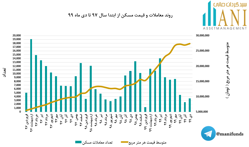 به گزارش روابط عمومی بانک مرکزی، تعداد معاملات آپارتمانهای مسکونی شهر تهران در دی ماه سال 1399، به 3،515 واحد مسکونی رسيد که نسبت به ماه قبل 38 درصد افزایش نشان میدهد . همچنین در ماه مورد گزارش، متوسط قيمت خريد و فروش يک متر مربع زیربنای واحد مسکونی معامله شده از طريق بنگاههای معاملات ملکی شهر تهران 4/27 میلیون تومان بود که نسبت به ماه قبل معادل 1،8 درصد افزایش نشان میدهد.
