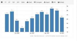 آمار ناامید کننده دیگر از آلمان اینکه شاخص اعتماد اقتصادی ZEW در ماه جولای با افت شدید 16.5 واحدی نسبت به ماه قبل به کمتر از 63.3 واحد رسیده که این پایین ترین رقم از ژانویه به شمار می رود و کمتر از انتظارات بازار بوده که آن را 75.2 واحد پیش بینی کرده بود.