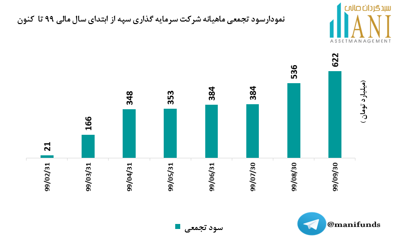 - شرکت سرمایه گذاری سپه با سرمایه 669،1 میلیارد تومانی از ابتدای سال مالی 99 (دوره یکساله کامل ) تا کنون توانسته است حدود 622 میلیارد تومان سود حاصل از فروش سرمایه گذاریها در بورس ایجاد نماید .